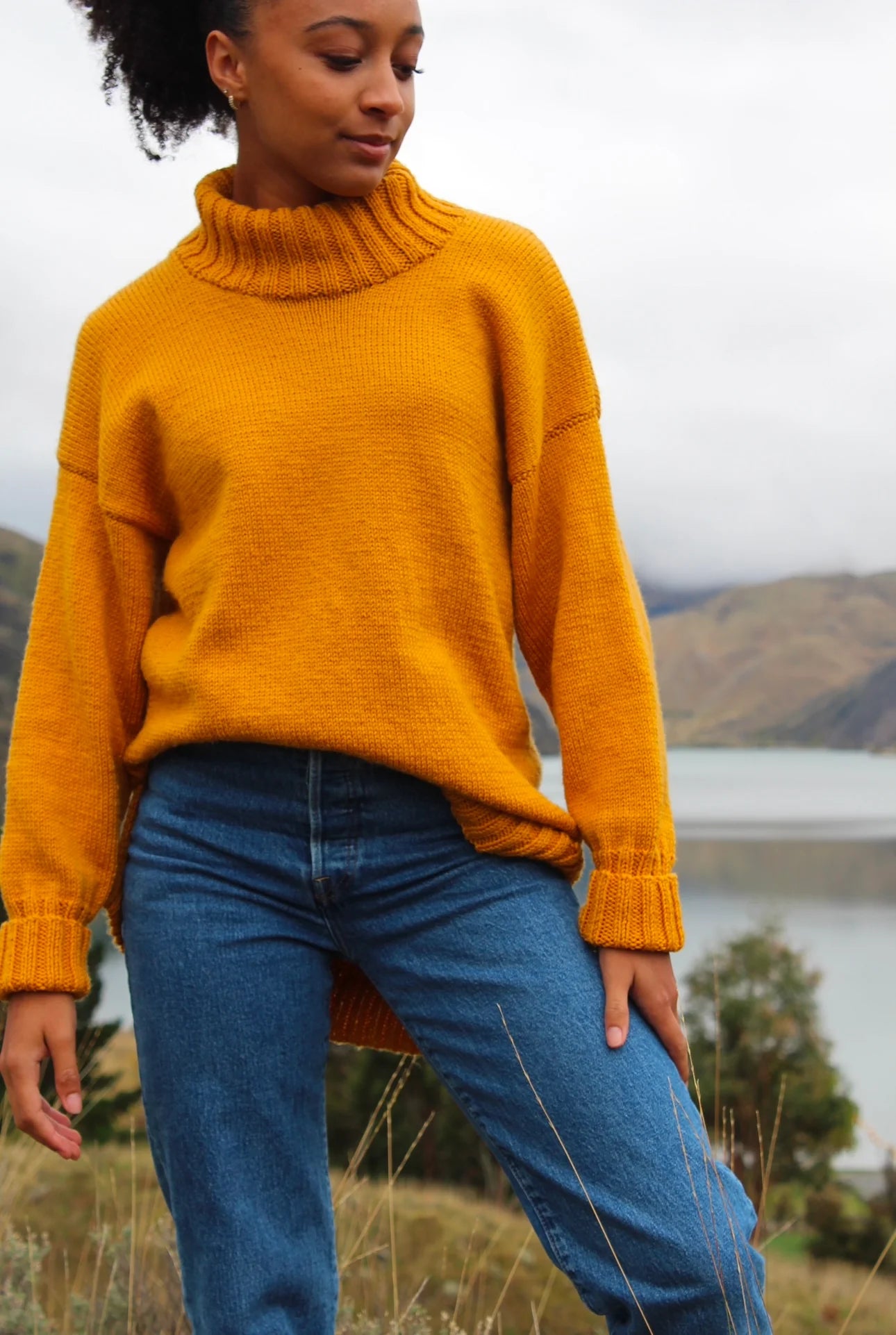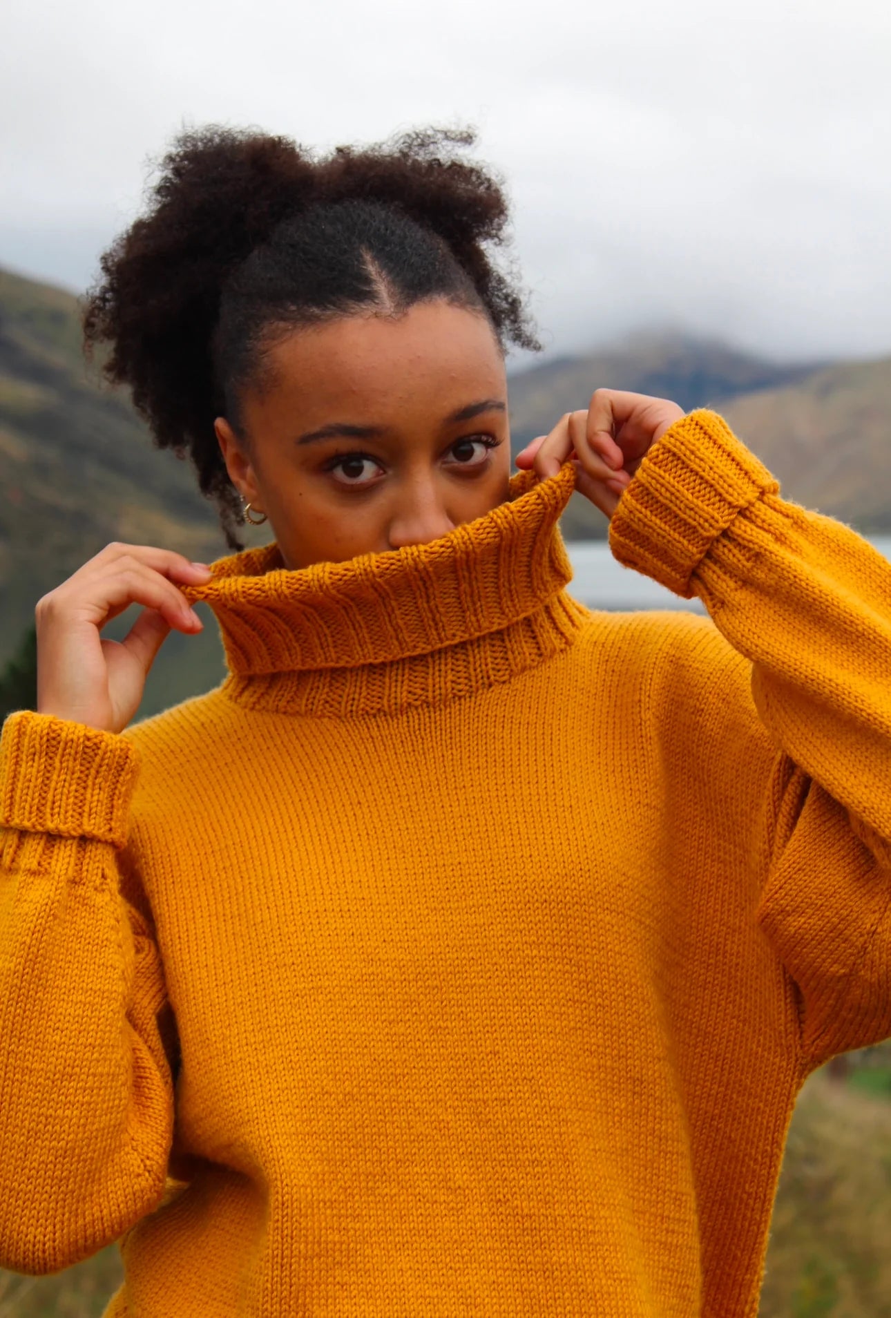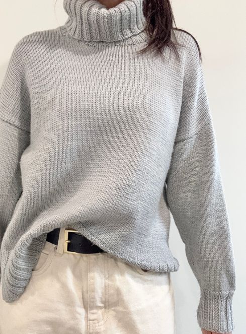 A stocking stitch jumper with high ribbed collar in 8ply/DK. Written in two lengths - short (waist) and long, the 8ply jumper is worked in pieces on straight needles from the bottom up.