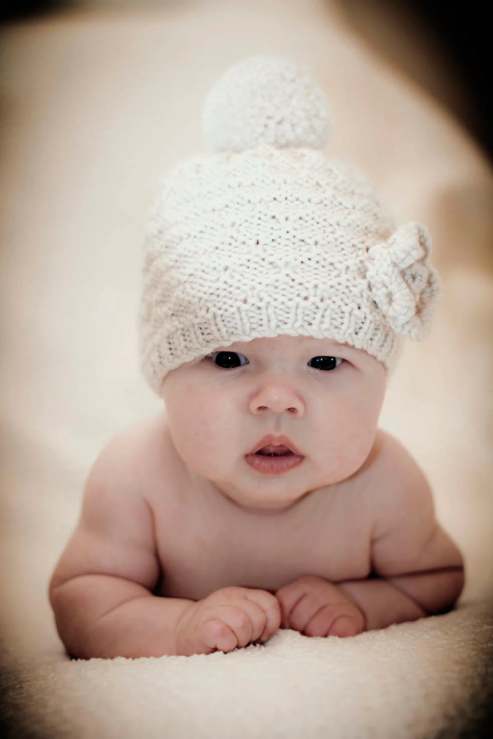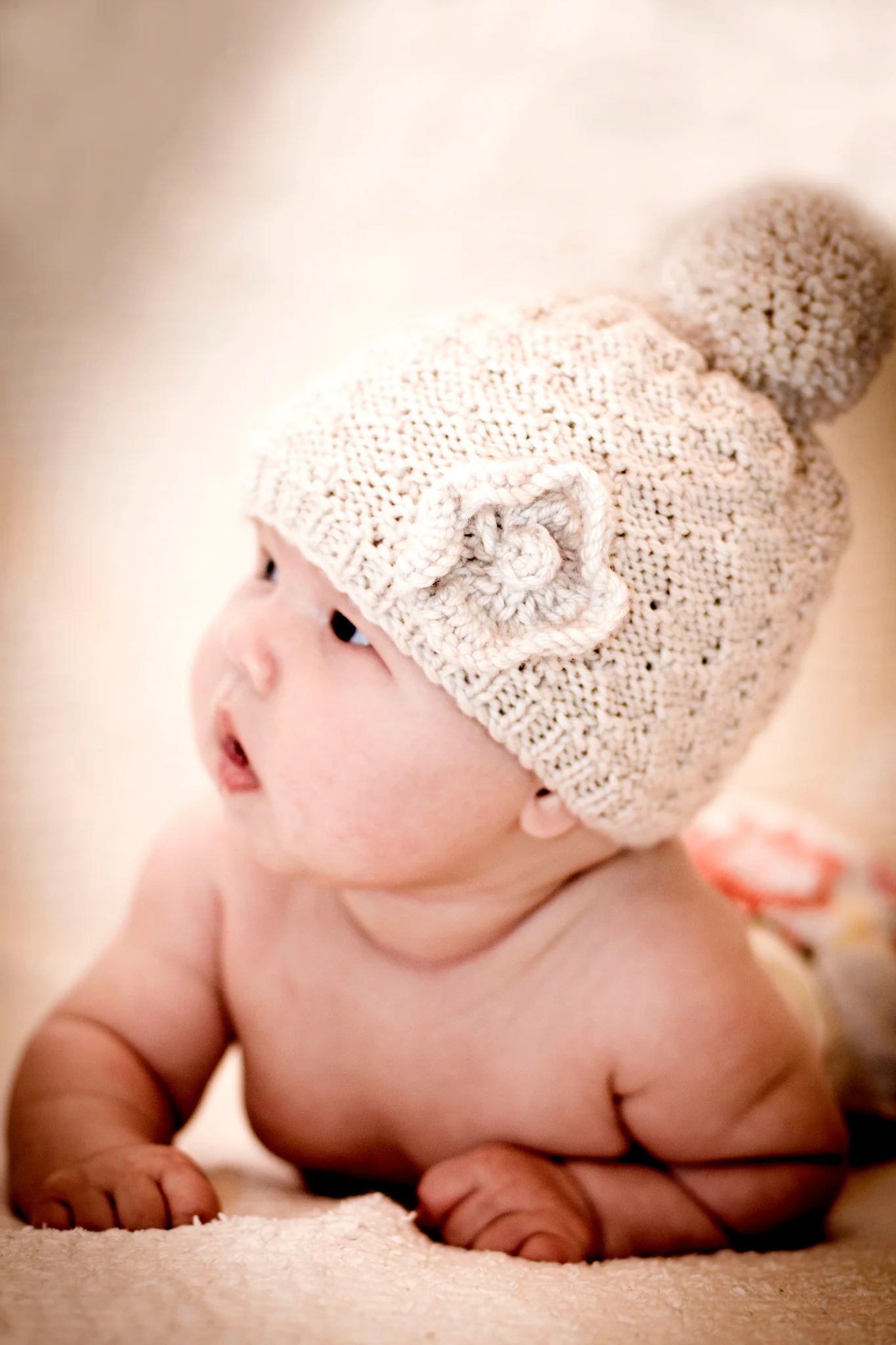 A cute diamond textured hat featuring a knitted flower and topped with a pompom.