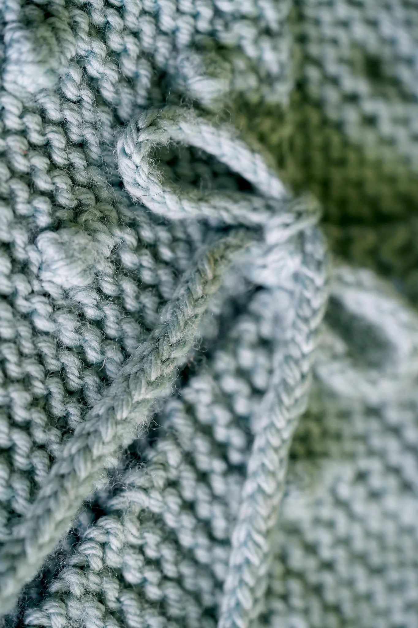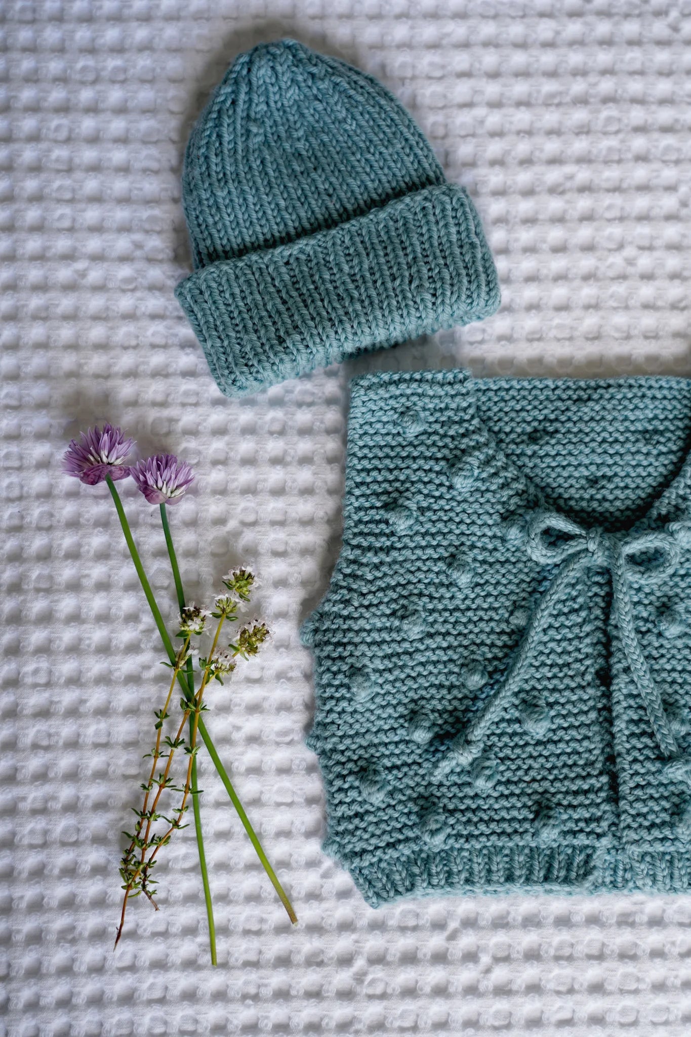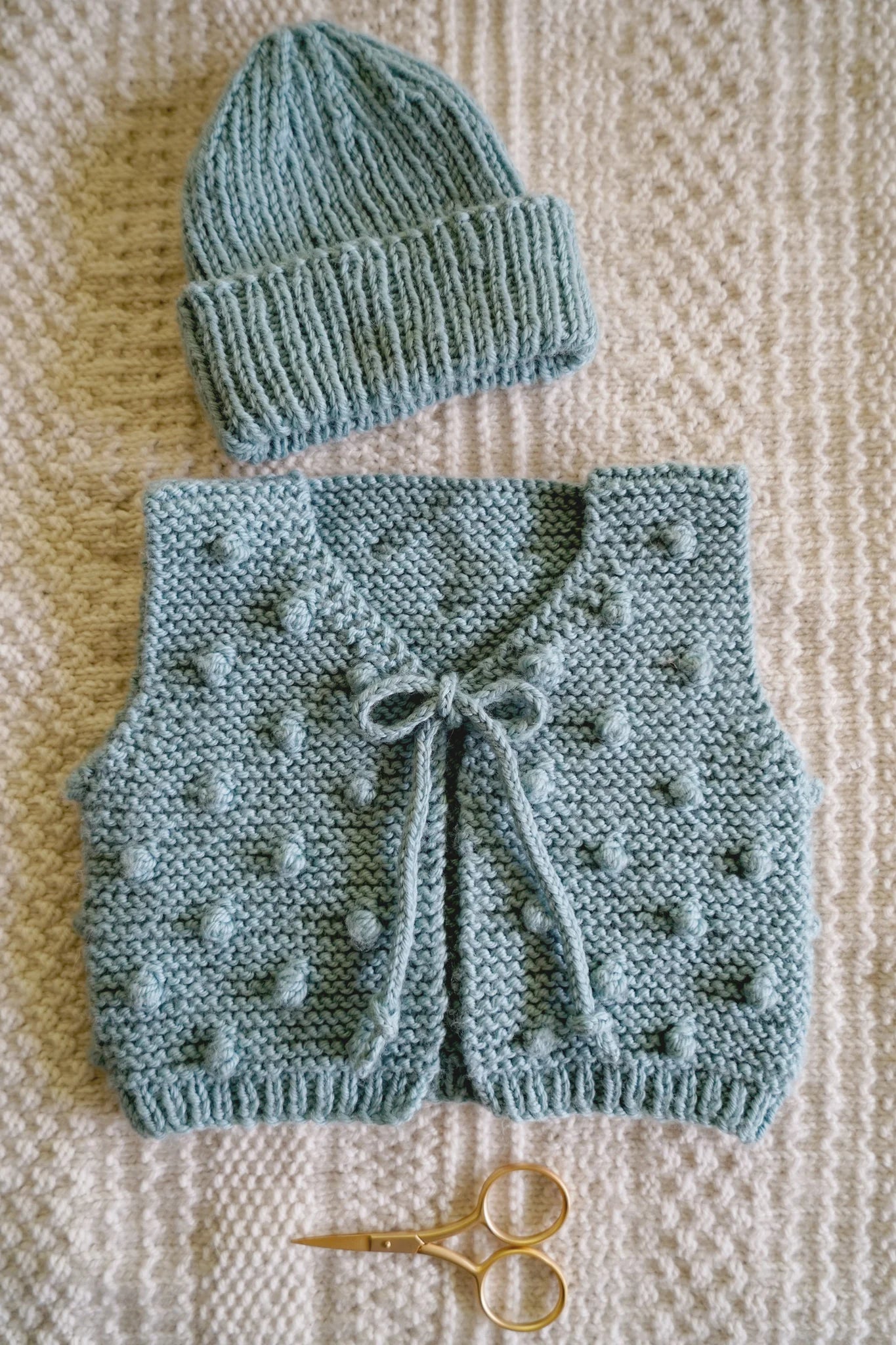A garter and bobble vest, knitted in one piece with icord ties. Teamed up with a rib beanie.