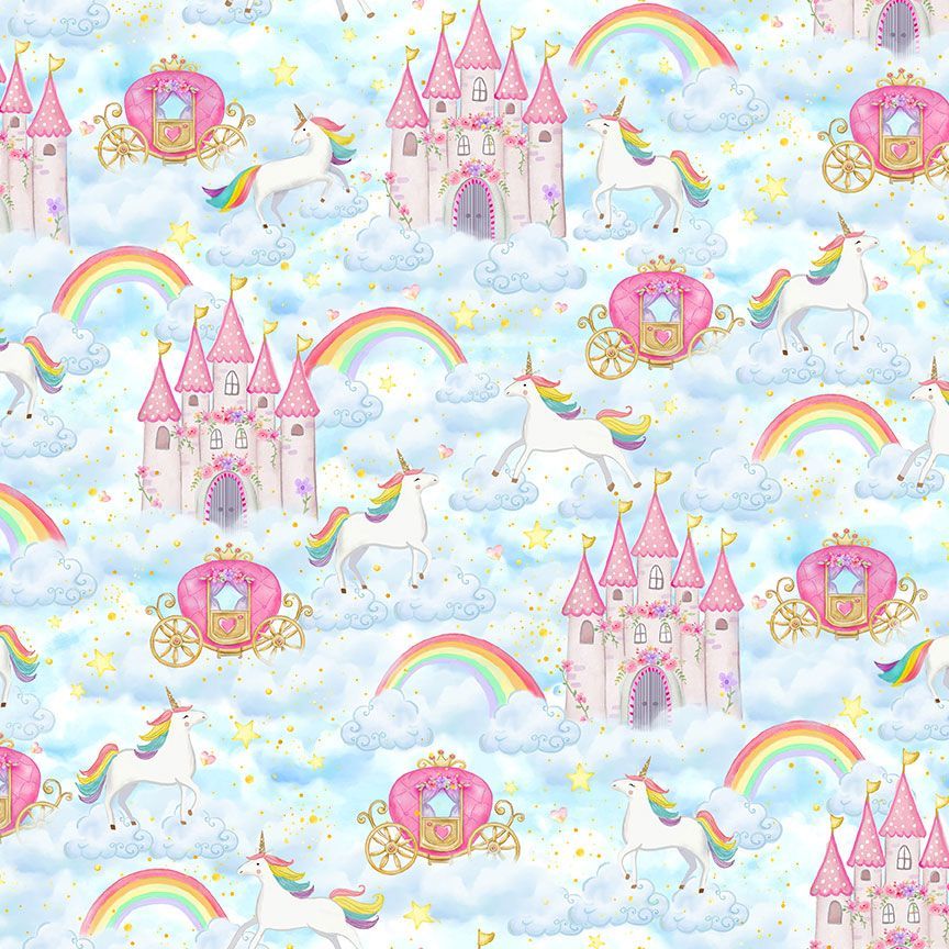 Colourful castles, rainbows and unicorns, perfect for kids clothes, toys, and decor.