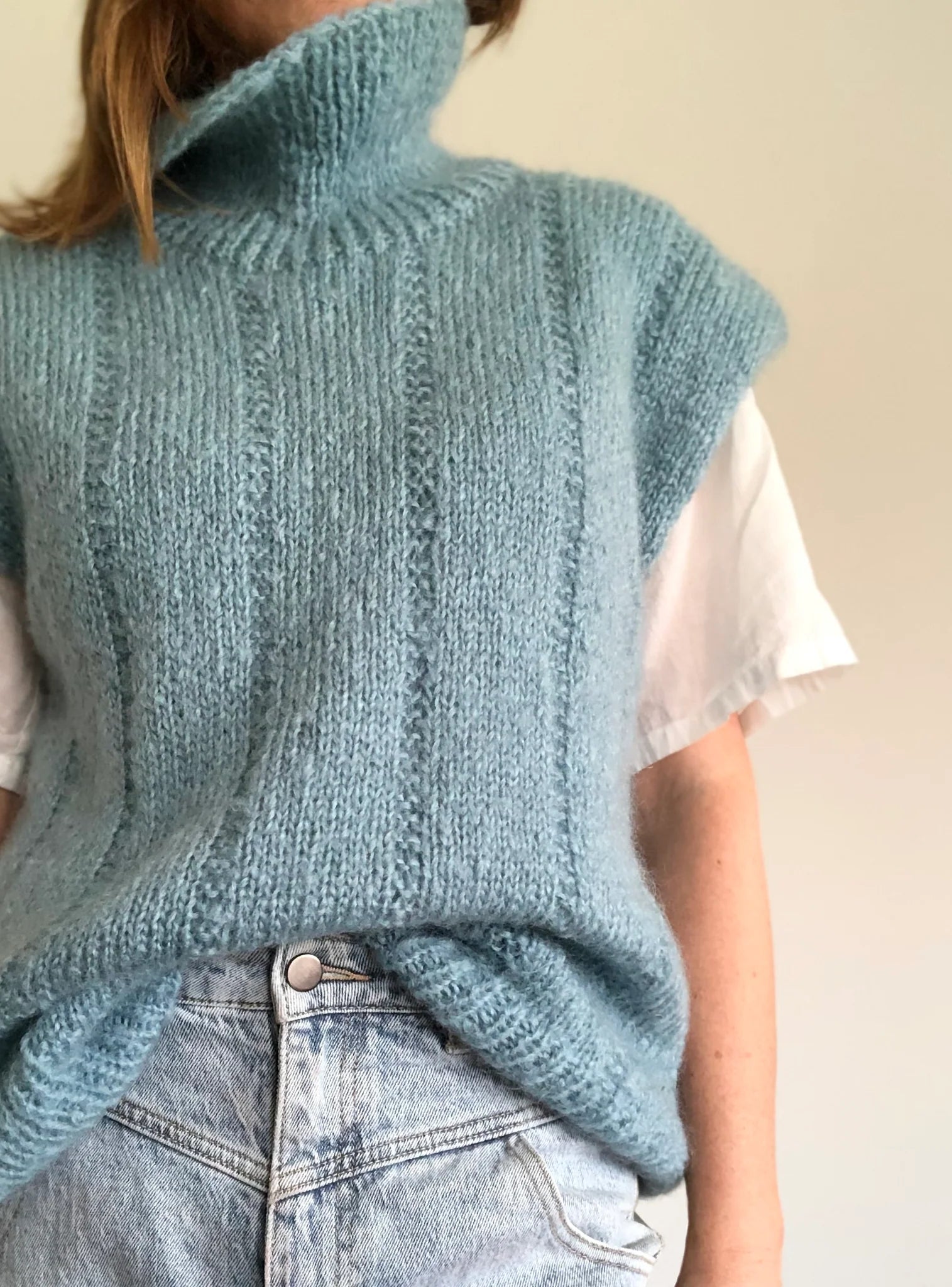 A high neck mohair vest with panelling detail and minimal shaping. The Crown Range Vest is worked in pieces on straight needles from the bottom up. Model wears the first size.