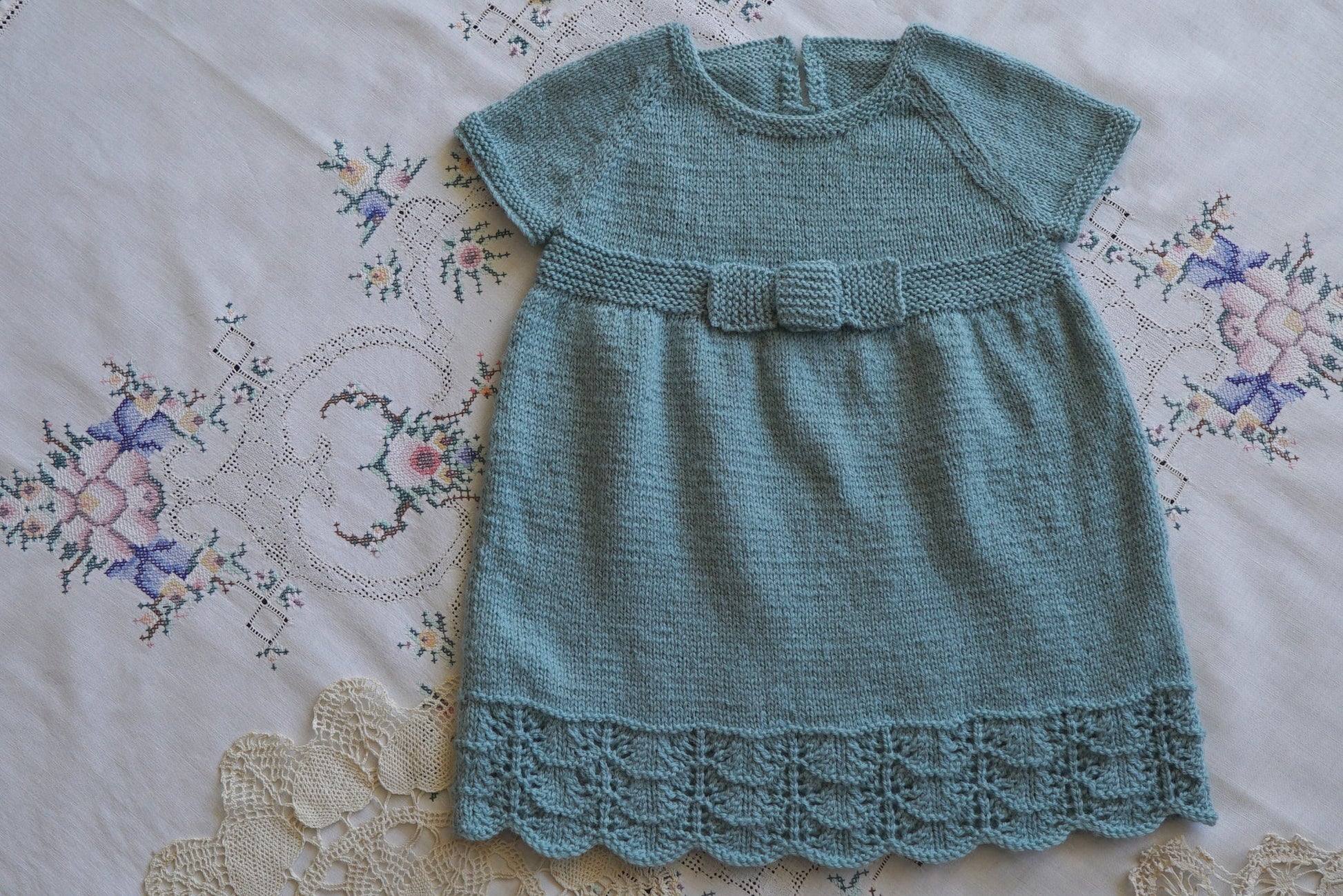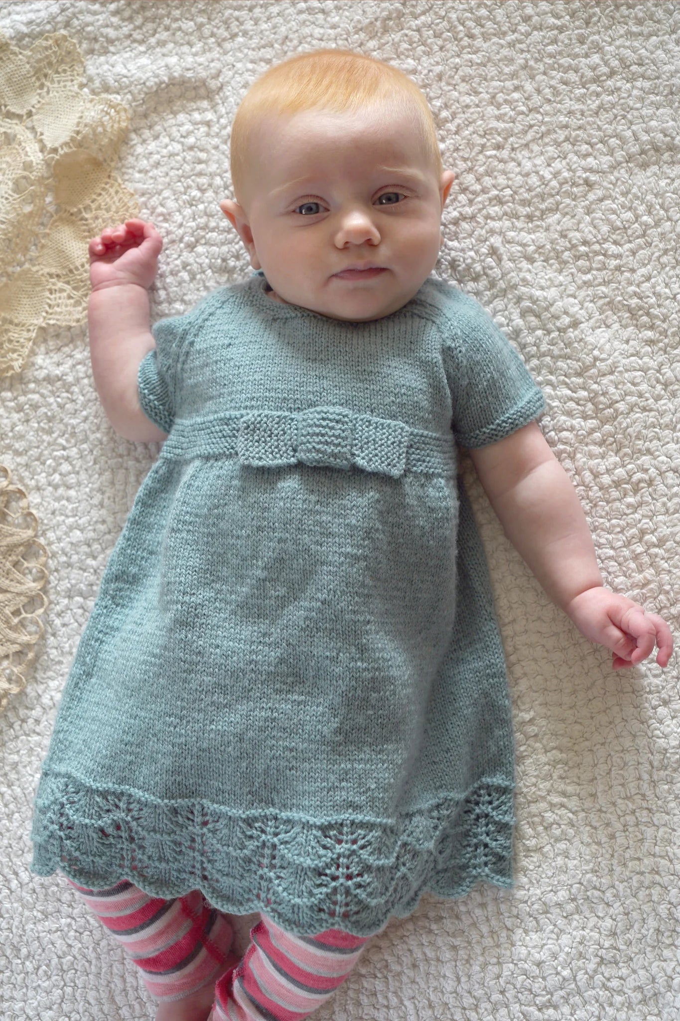 The Eleanor Dress from Lisa F Design is a pretty dress detailed with a knitted bow, lace edging, garter stitch trim, and raglan short sleeves.