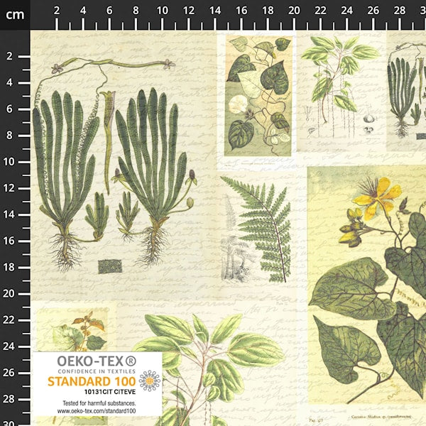 A bright botanical print featuring botanicals and seed packets intersperced with various texts on a predominantly cream background.