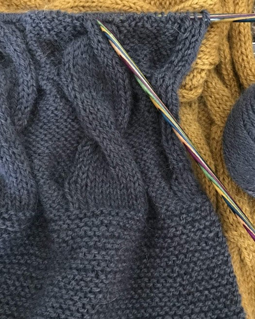 Yarn: 10-12ply - 3 x 100gm/6 x 50g balls (cable) or 2 x 100gm/4 x 50 gm balls (garter)Needles: 5.5mm