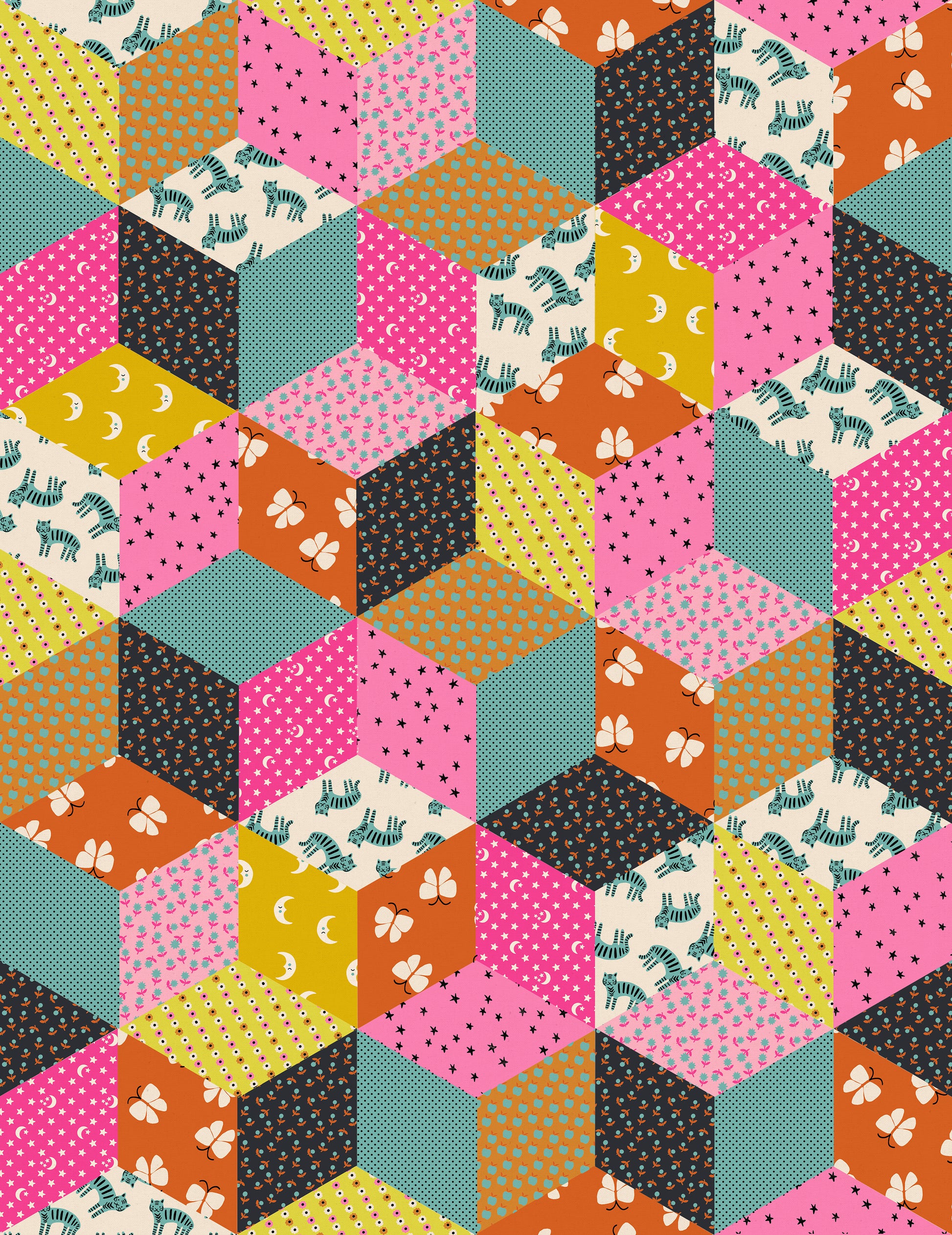 This collection from Alexia Marcelle Abegg is a mashup of all of her favorite things! The tumbling blocks print anchors this collection, with the addition of things like sardines, moons and stars, snakes, butterflies, her famous mini dots, and a print dedicated to all things lucky!