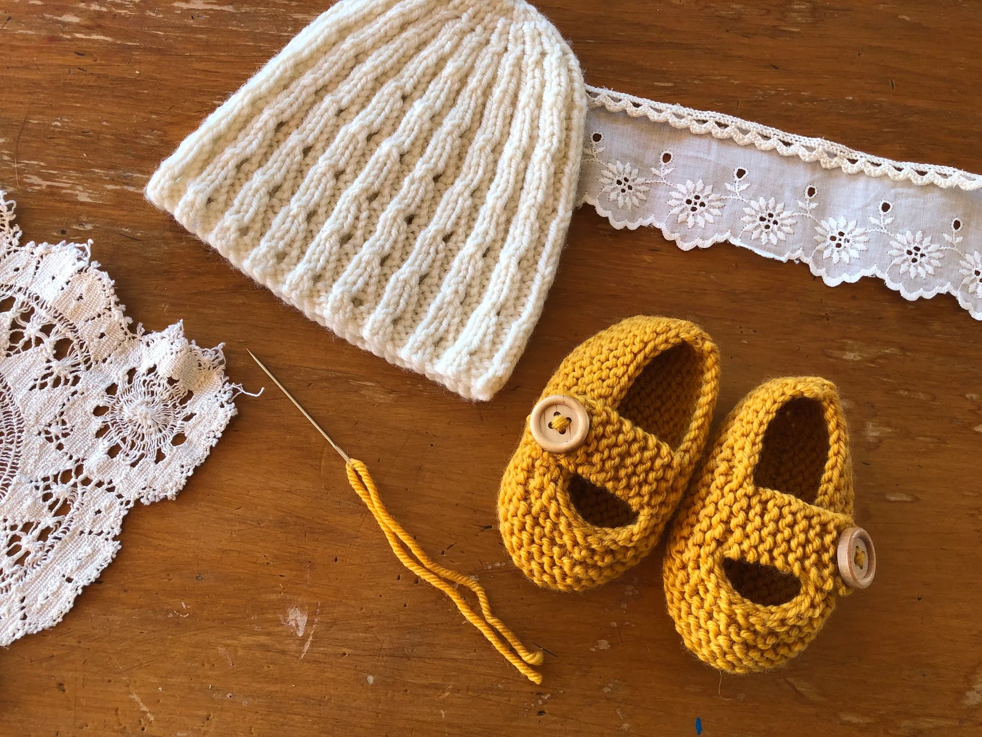 The Princess Nova Beanie & Shoes from Lisa F Design is a pretty lace rib beanie with garter stitch shoes - an easy knit pattern for newborn gifts. The hat pattern has two versions - knitted flat on straight needles or in the round on double pointed needles.