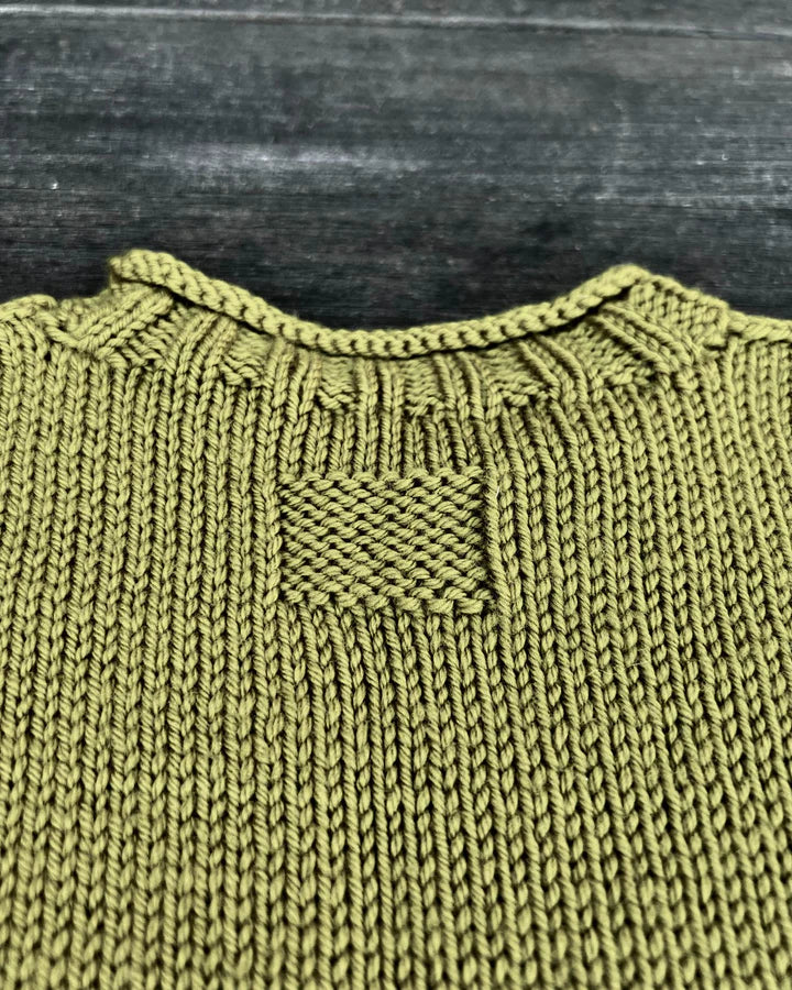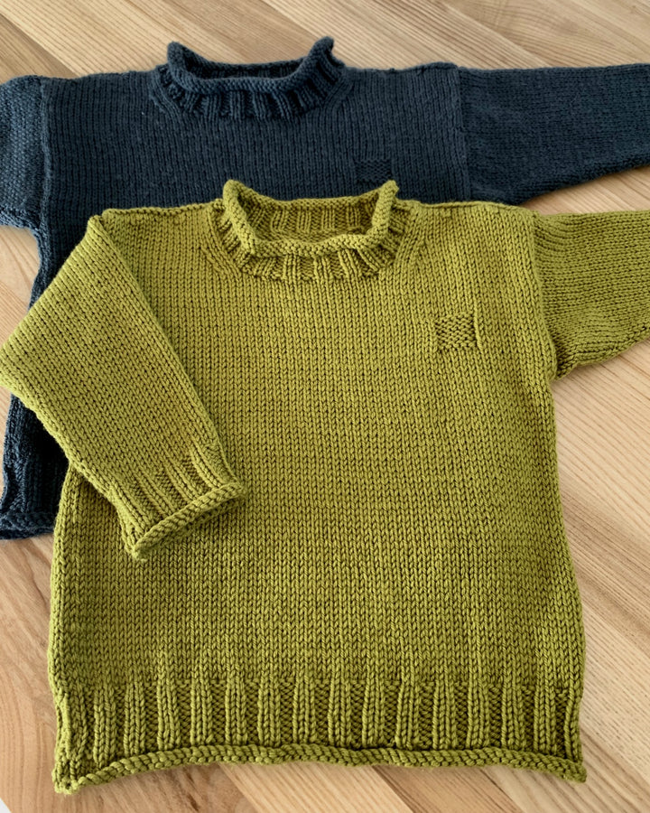 The Rolled Edge Jumper from The Kiwi Stitch & Knit Co is a relaxed fit, drop sleeve jumper with a rolled edge and a square motif.