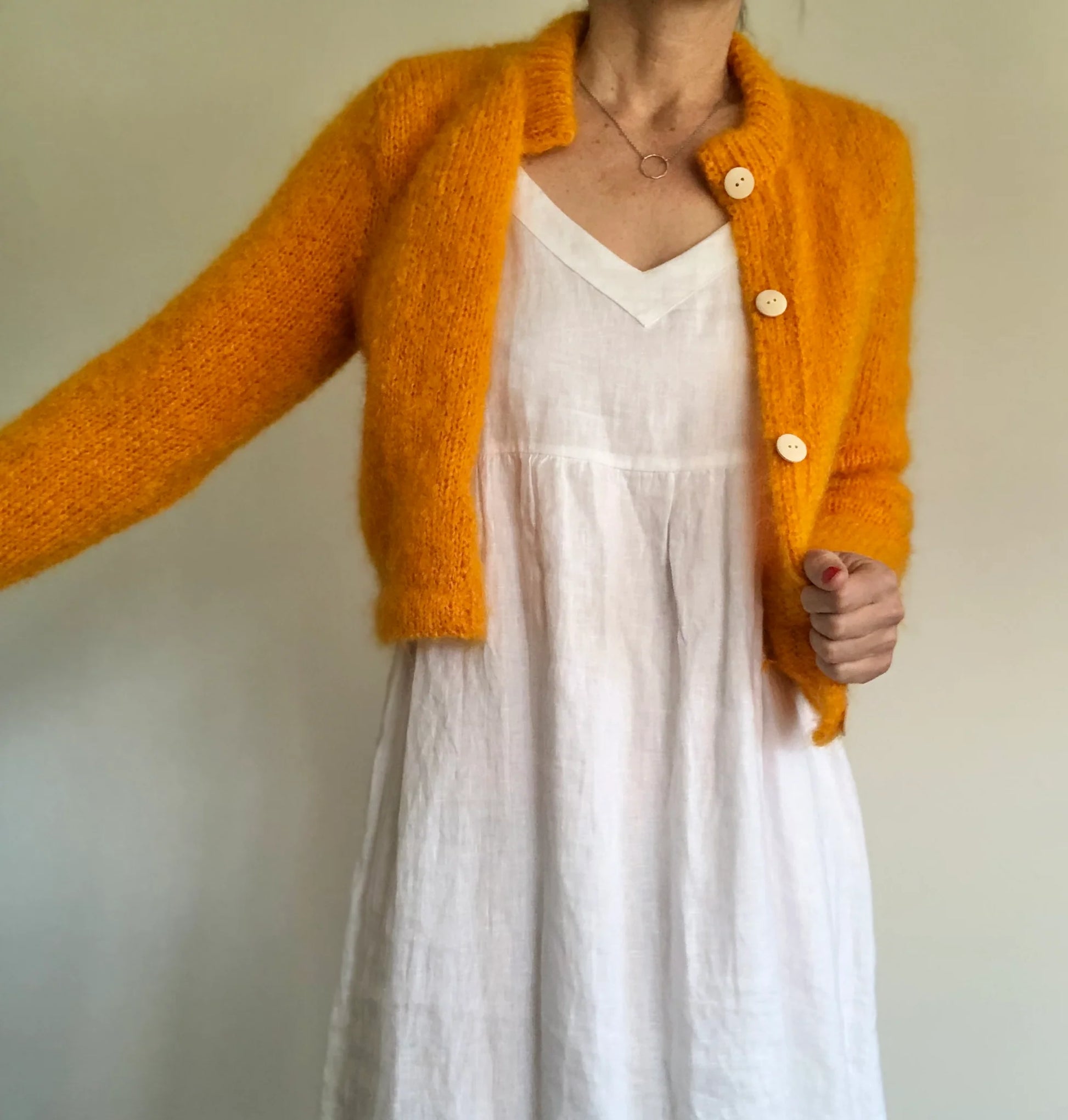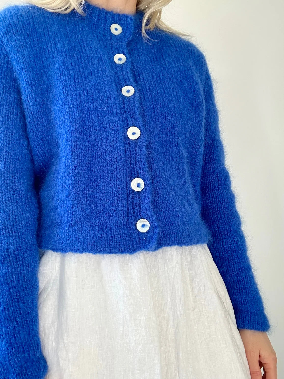 A cute classic crew neck adults cardigan, Sadie is worked in pieces on straight needles from the bottom up.
