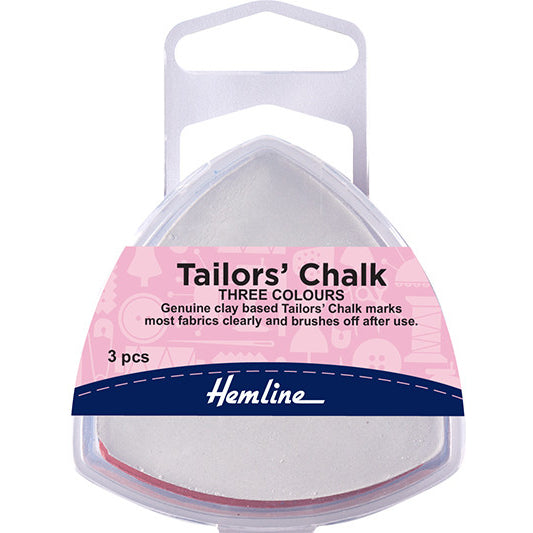 Clay-based triangular Tailor’s chalk used for marking fabrics clearly and brushes off after use. Tablet markers supplied in three colours.